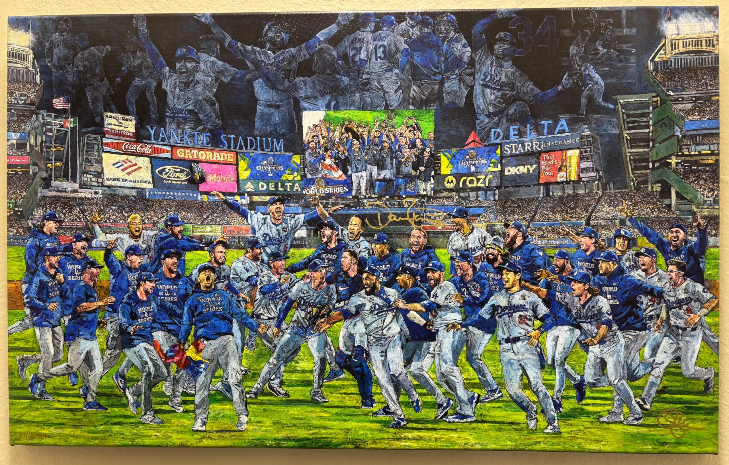 This Giclee Canvas print was originally painted by sports artist Opie Otterstad to commemorate the 2024 Los Angeles Dodgers World Series win. Each print is hand signed by Dodgers manager Dave Roberts & artist Opie Otterstad with Gold paint pen. The Dave Roberts autograph has been authenticated by MLB. Edition limited to 2,024.